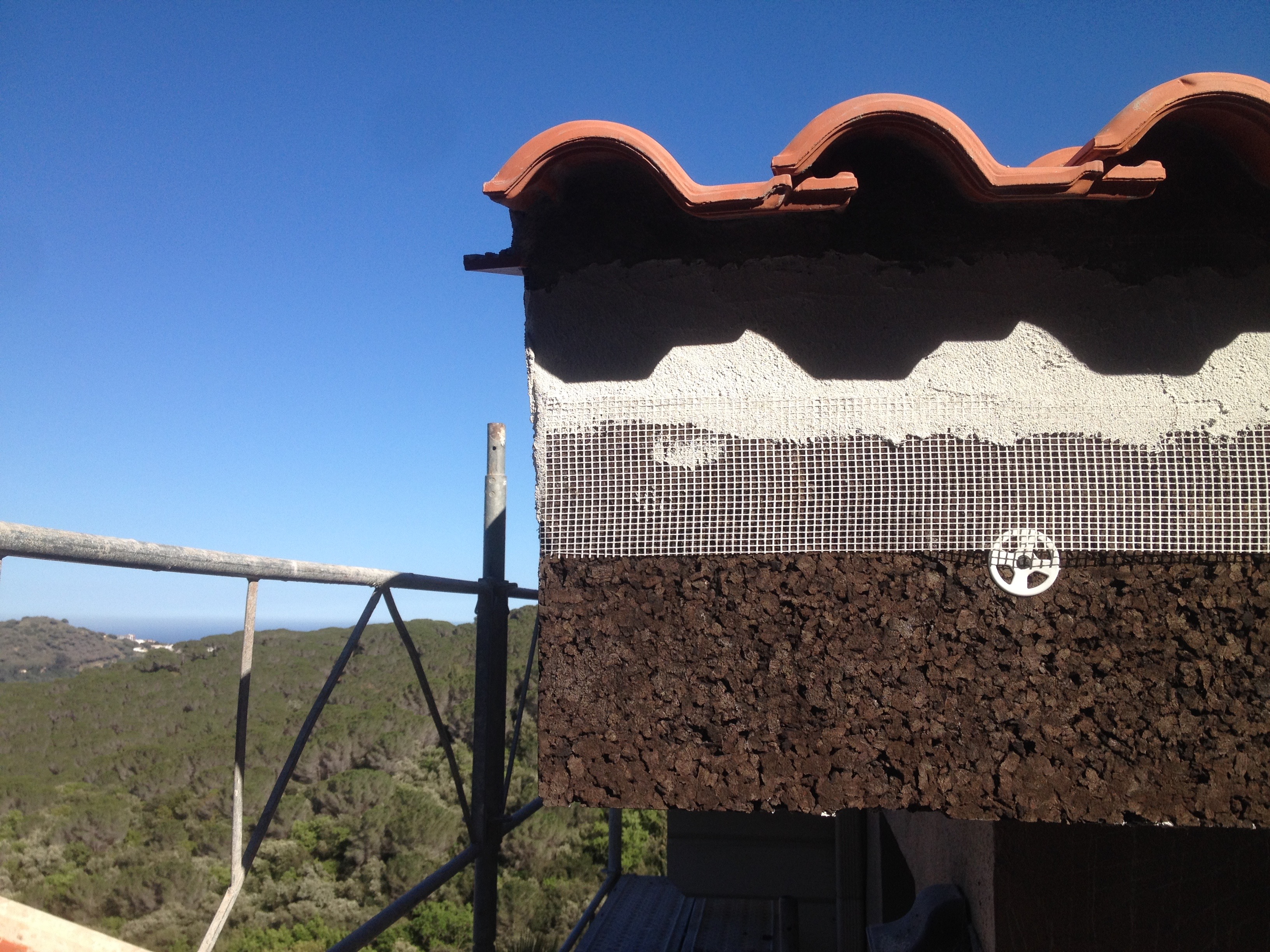 • Una placa de corcho aglomerado natural de 8 cm de grueso, con un sistema de fijación química con mortero adhesivo a base de cales hidráulicas naturales que incorpora virutas de corcho, y fijación mecánica con tacos expansivos plásticos de 12 cm.